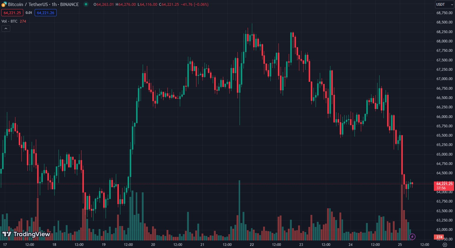 Курс биткоина начал снижаться еще 24 июля на фоне новости о том, что клиенты криптобиржи Kraken получили первые выплаты от Mt. Gox. Днем ранее, 23 июля, с криптокошельков Mt. Gox вывели биткоины на более чем $3 млрд для дальнейшего распределения. На момент написания первая криптовалюта торгуется вблизи $64 220: