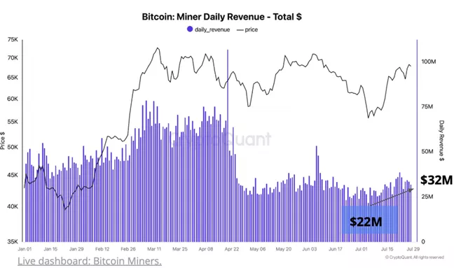 «Ежедневный отток биткоинов с кошельков майнеров в июле оставался в пределах 5000–10 000 BTC по сравнению с 10 000–20 000 BTC в начале марта, когда курс впервыедостиг $70 000 и ниже скачков, наблюдавшихся в апреле-мае, после халвинга», — говорится в отчете.