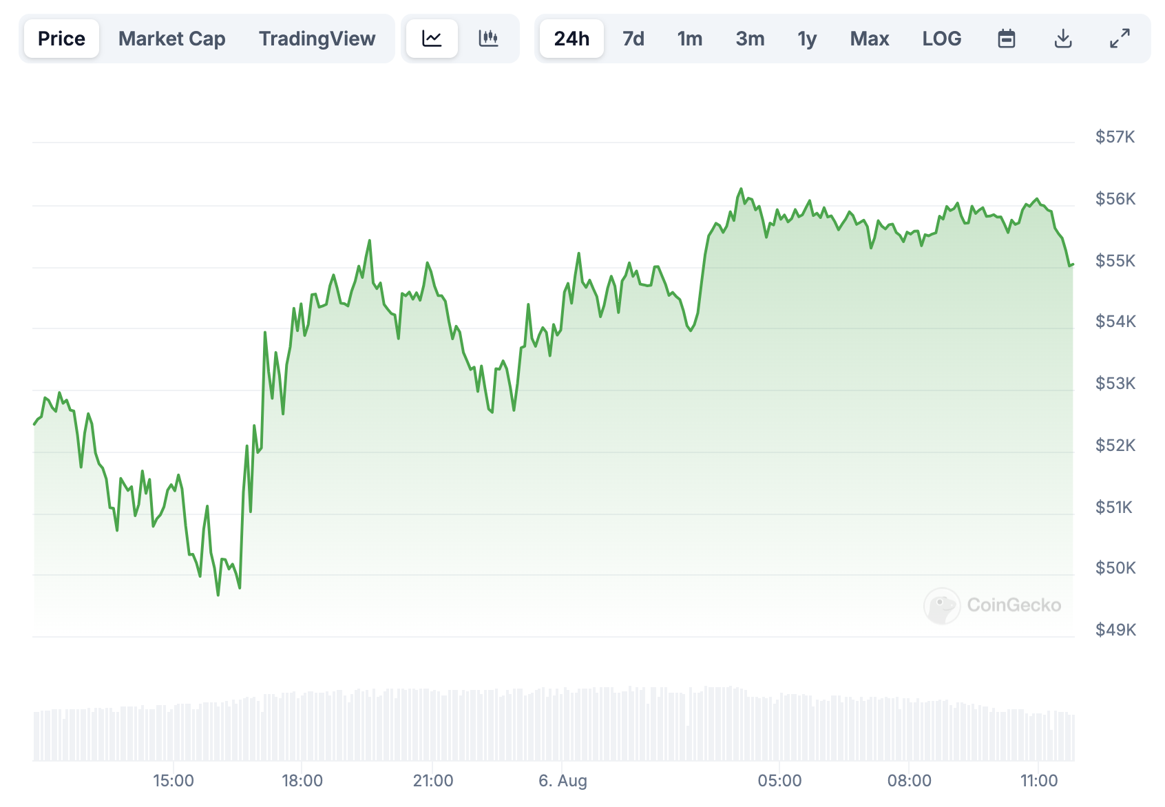 Однако к моменту написания материала курс флагмана крипторынка подает признаки восстановления. По данным CoinGecko, сейчас актив торгуется по $55 004, подорожав за последние сутки почти на 5%.