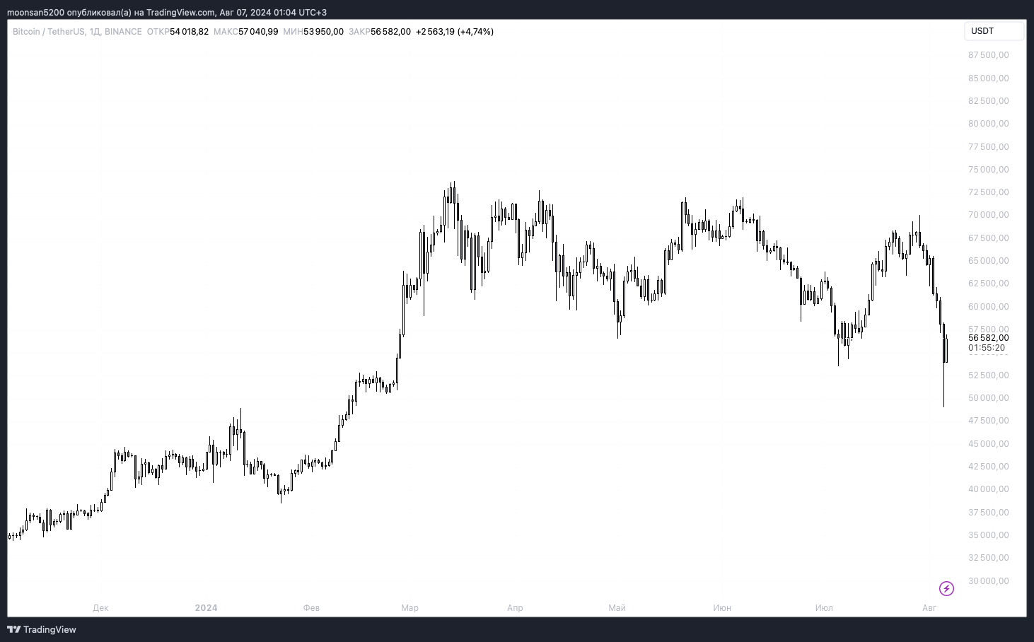 Обвал произвёл впечатление на представителей индустрии. Вслед за ним почти треть пользователей децентрализованной платформы для ставок Polymarket в рамках определённой ставки сошлись во мнении, что BTC будет стоить дешевле 45 тысяч долларов к началу сентября.