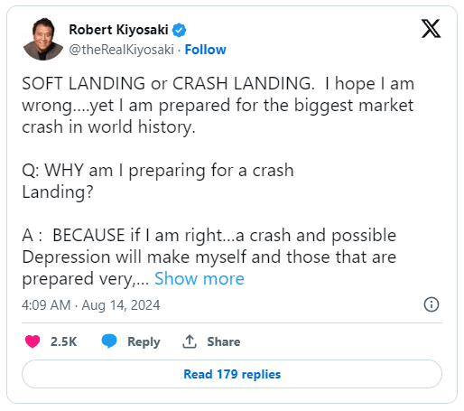 Продолжая предупреждать о надвигающихся плохих временах как для Соединённых Штатов, так и для остального мира, Роберт Кийосаки вновь заговорил о приближении «крупнейшего крахе рынка в мировой истории».