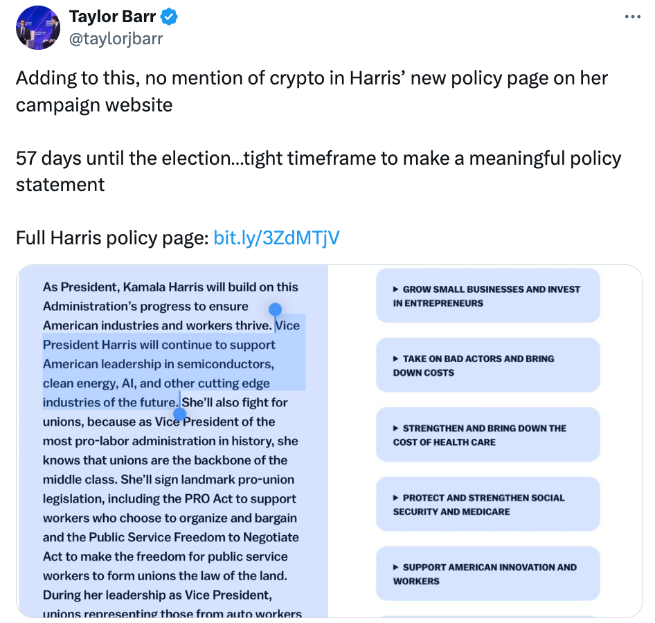 В обновлении страницы «проблемы» веб-сайта кампании Харрис-Уолтс от 9 сентября избирательный бюллетень Демократической партии выделил несколько политик, отличающихся от кампании кандидата от Республиканской партии Дональда Трампа. Официальная платформа республиканцев — под руководством невестки Трампа — включала формулировку о «поощрении инноваций» с использованием криптовалюты, в то время как кампания Харрис сосредоточена на политике в пользу среднего класса.