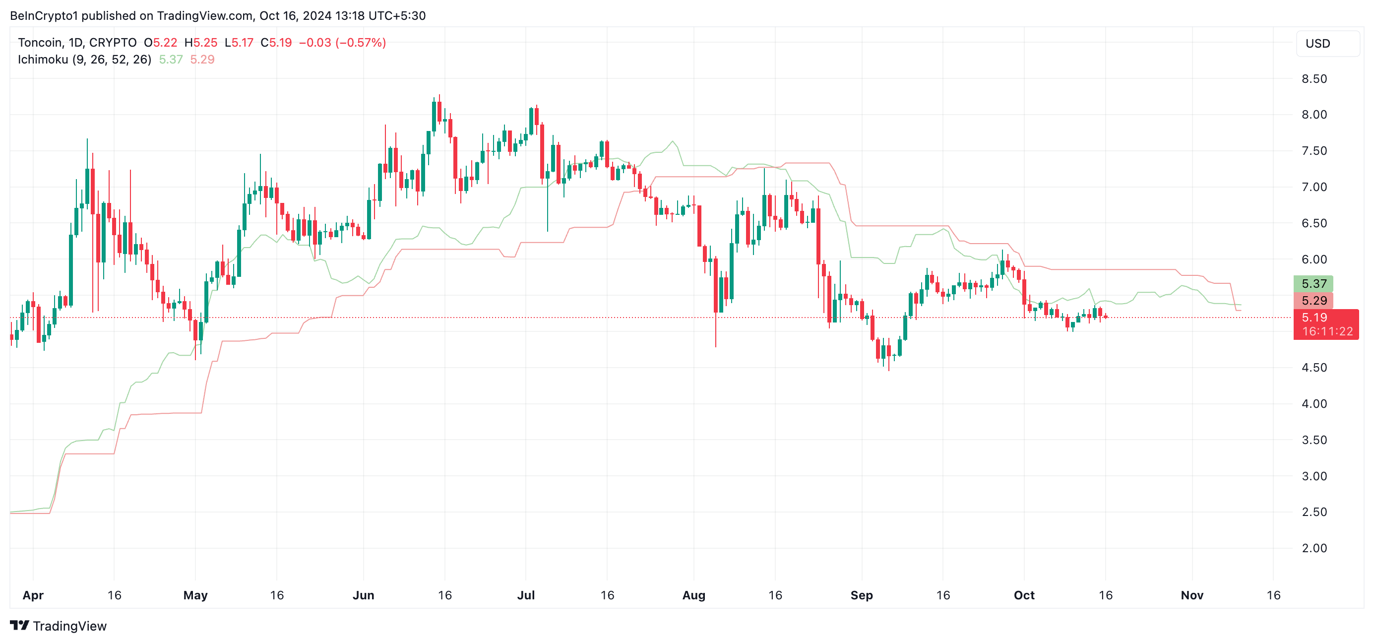 Тем не менее, если спрос на альткоин возобновится, медвежий сценарий может оказаться ошибочным. В этом случае Toncoin получит шанс преодолеть сопротивление, сформированное облаком Ишимоку, что позволит ему вырасти до $7,46.
