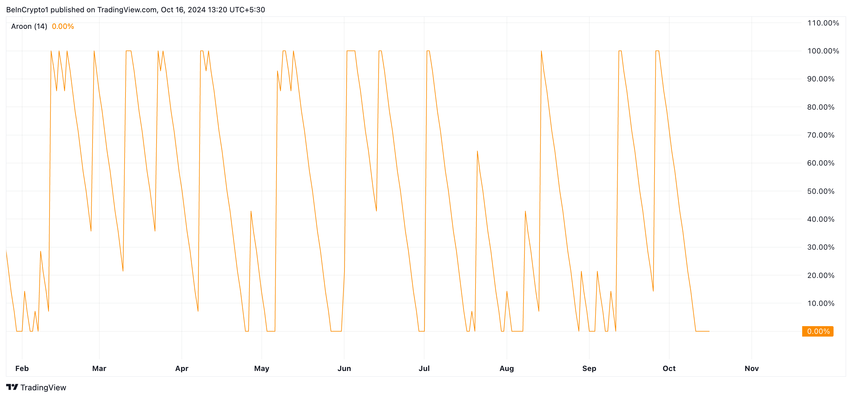 К тому же, значение линии Aroon Up равно 0%. Это означает, что в течение анализируемого периода (обычно 14 дней) цена актива не достигала новых максимумов. Такое положение дел свидетельствует о медвежьем настроении на рынке и утрате импульса роста.