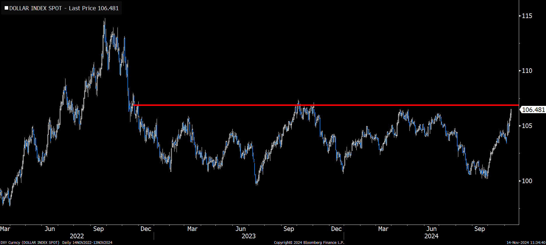 Скорее всего, индекс доллара DXY достиг своего пика. Эффект запаздывания, на который сейчас обращают внимание в Твиттере, всё ещё реален. Однако в конечном итоге ФРС снова размахивает бычьим флагом для активов с высоким риском. Я позитивно настроен на 2025 год.