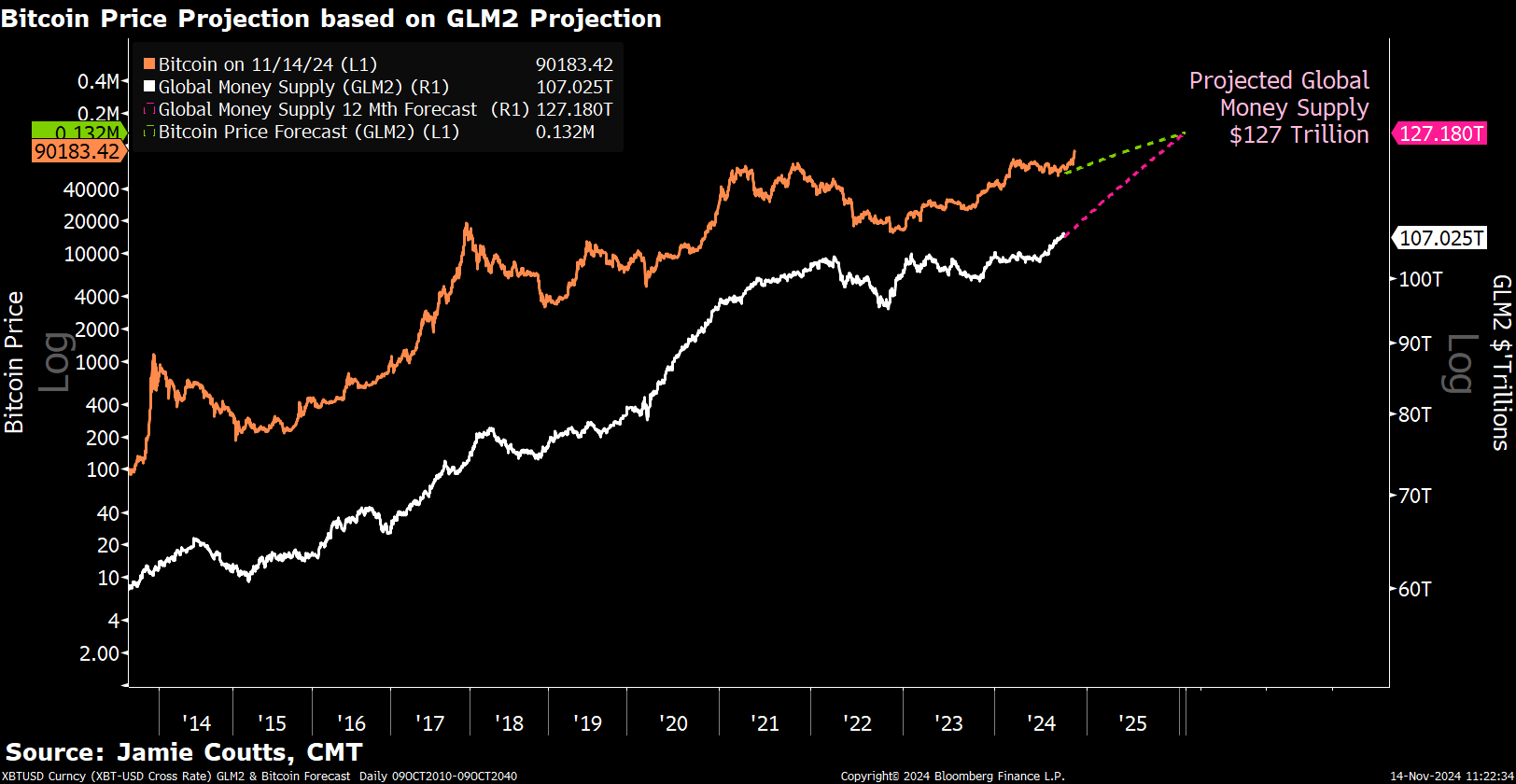 Рост денежной массы в состоянии привести к росту цены Биткоина до более чем 132 тысяч долларов в течение следующего года, считает Куттс. Если по-простому, то увеличение количества денег в распоряжении людей побудит их инвестировать часть капитала.