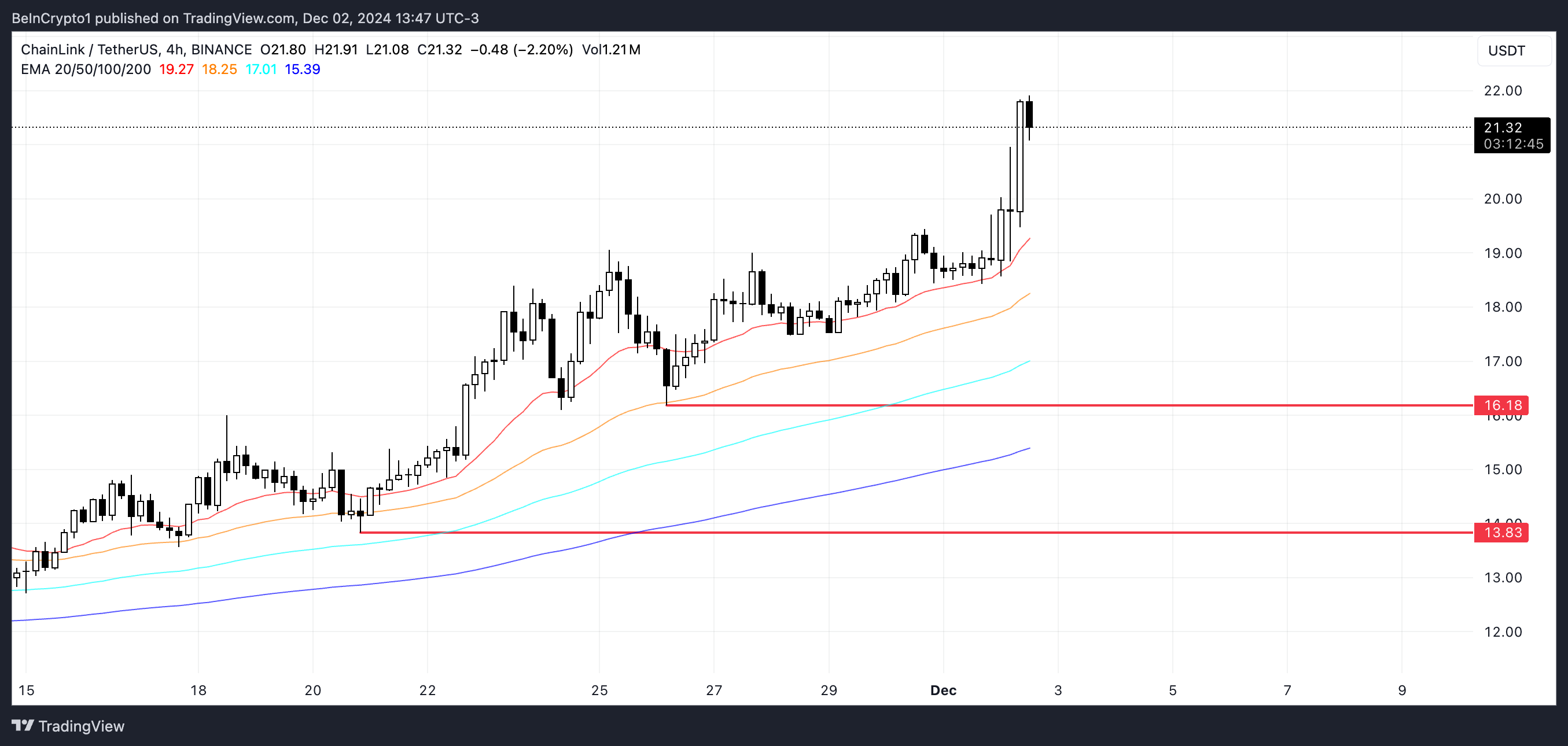 Индикатор BBTrend, хотя и остаётся положительным с 25 ноября, значительно ослаб. Несмотря на эти противоречивые сигналы, цена LINK может вырасти на 42% до 30 долларов, если успешно преодолеет текущие уровни сопротивления.