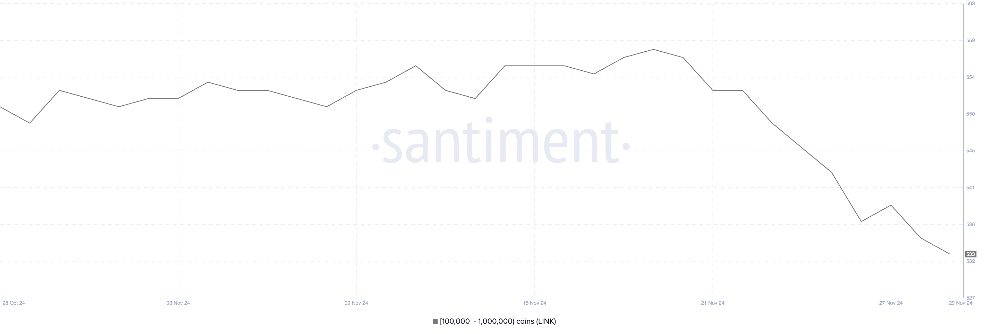 Количество кошельков, содержащих от 100 000 до 1 000 000 LINK, сократилось с 558 19 ноября, что является годовым максимумом, до 533 в настоящее время, что говорит о том, что крупные инвесторы, возможно, фиксируют прибыль или перераспределяют свои активы.