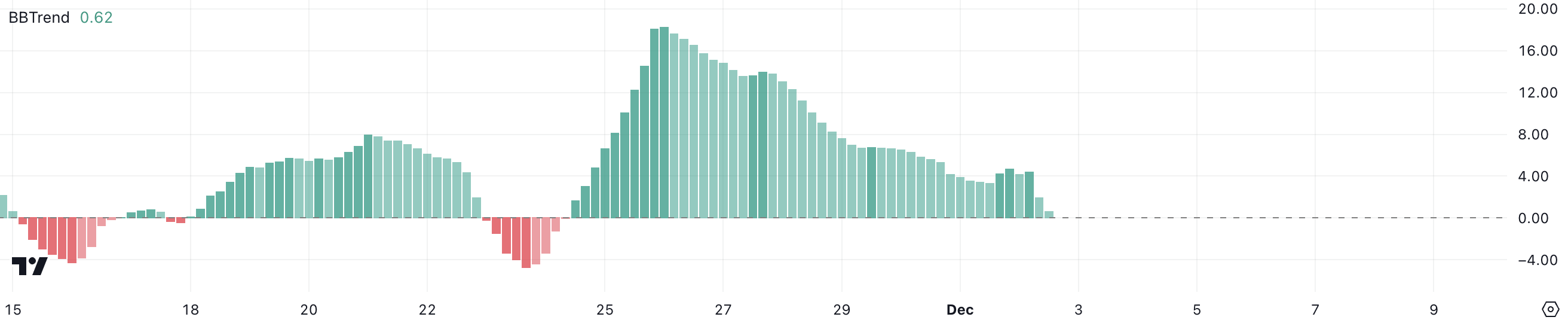 Индикатор Chainlink BBTrend (тренд по полосам Боллинджера) значительно ослаб, снизившись с максимума 18,2 26 ноября до 0,44 в настоящее время, но оставаясь на положительной территории с 25 ноября.