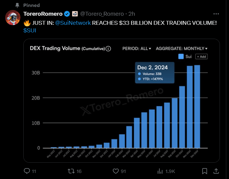 Объем торгов Sui Network на DEX превысил $33 млрд., увеличившись на 1479% с начала года.