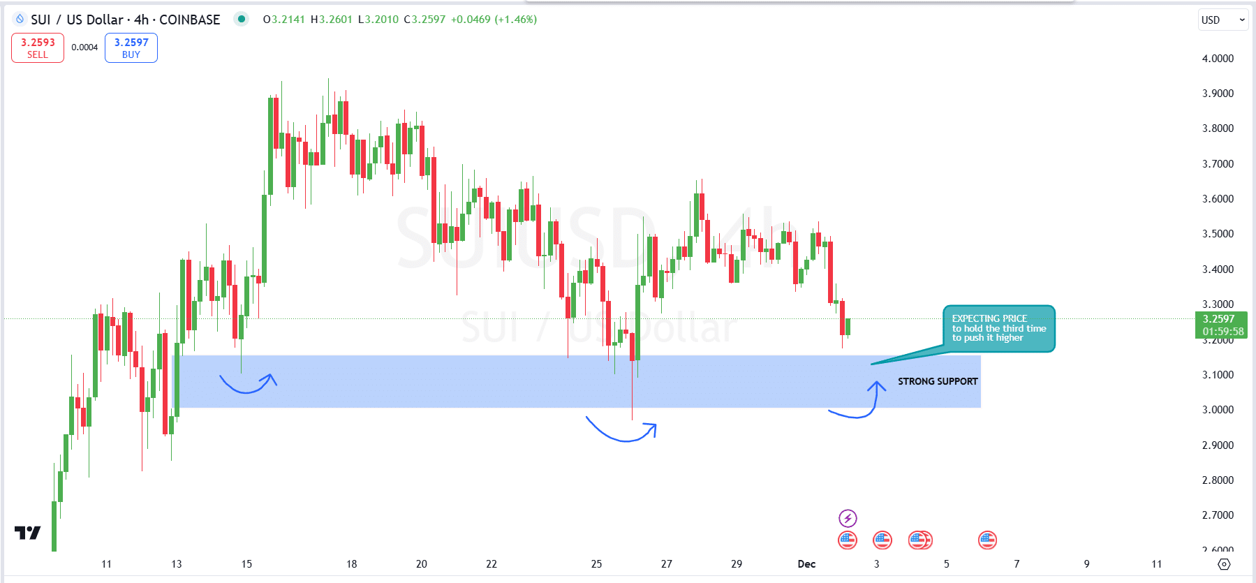 На 4-часовом графике SUI несколько раз протестировал уровень $3,20, что свидетельствует о его важности как ключевой зоны поддержки.