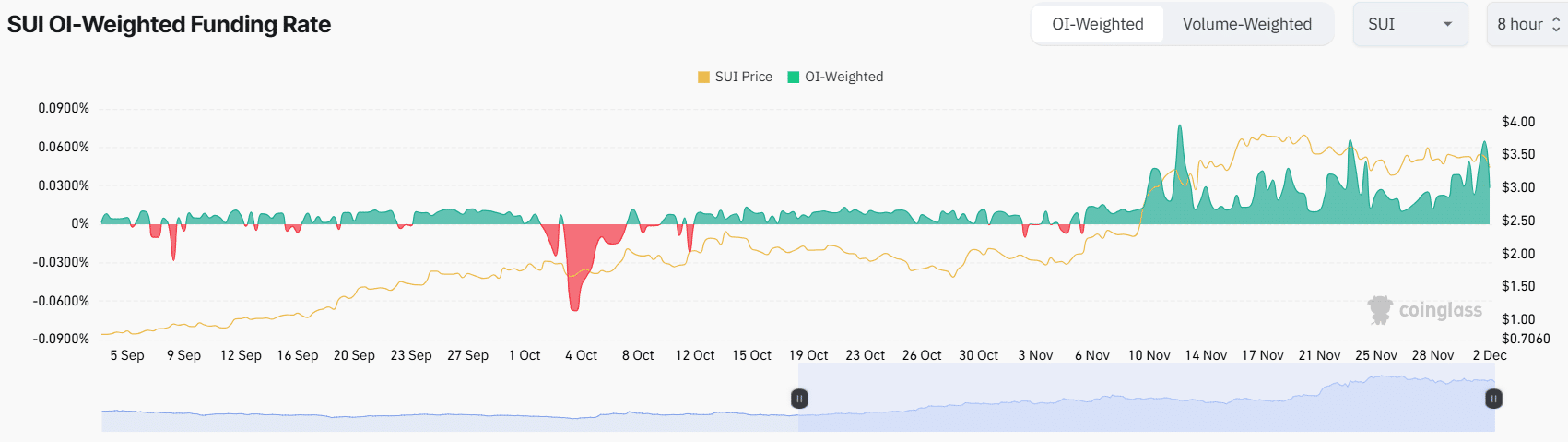 Ставки финансирования SUI неизменно оставались положительными – признак бычьего настроения среди трейдеров бессрочных контрактов. С середины ноября ставки оставались выше 0,03%, достигая пика в 0,06% во время ценового ралли с $2,80 до $3,60.