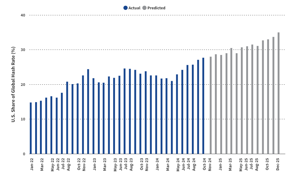Доля криптопроектов с разработчиками в США вырастет с 19% до 25%. К концу 2025 года вклад американских майнеров в глобальный хешрейт достигнет 35%.
