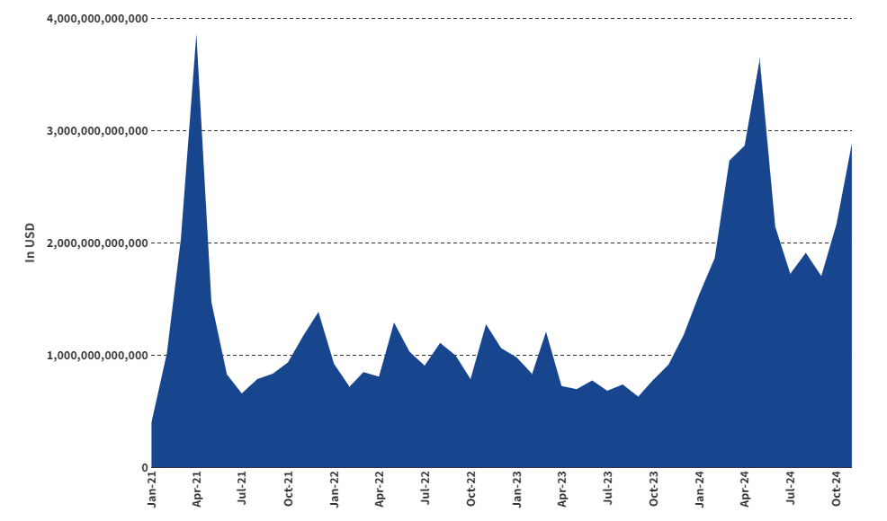 По мнению аналитиков, к концу 2025 года суточный объем транзакций достигнет $300 млрд — в три раза больше показателя около $100 млрд за ноябрь 2024.