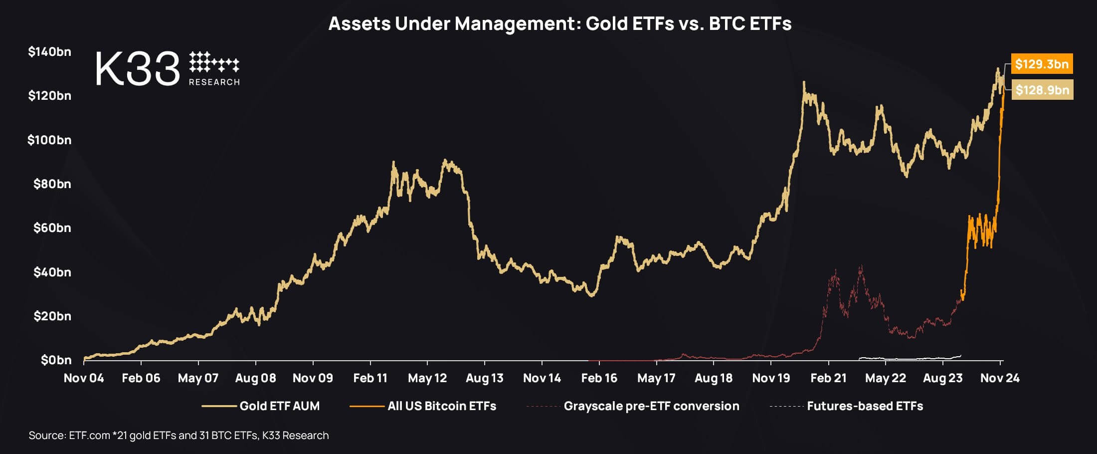 Что особенно важно, на этой неделе объём активов под управлением Биткоин-ETF в США опередил соответствующий показатель биржевых фондов на золото. Добиться такого результата удалось быстрее, чем за год с момента появления новинок.