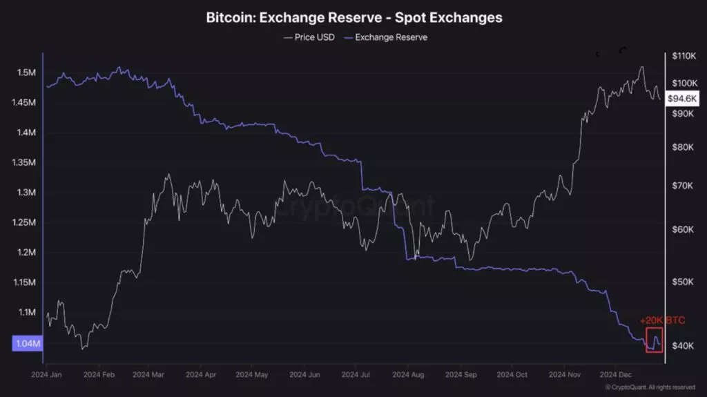 Контрибьютор CryptoQuant под ником IT Tech отметил рост биткоин-резервов централизованных бирж — на ~20 000 BTC за последние дни.