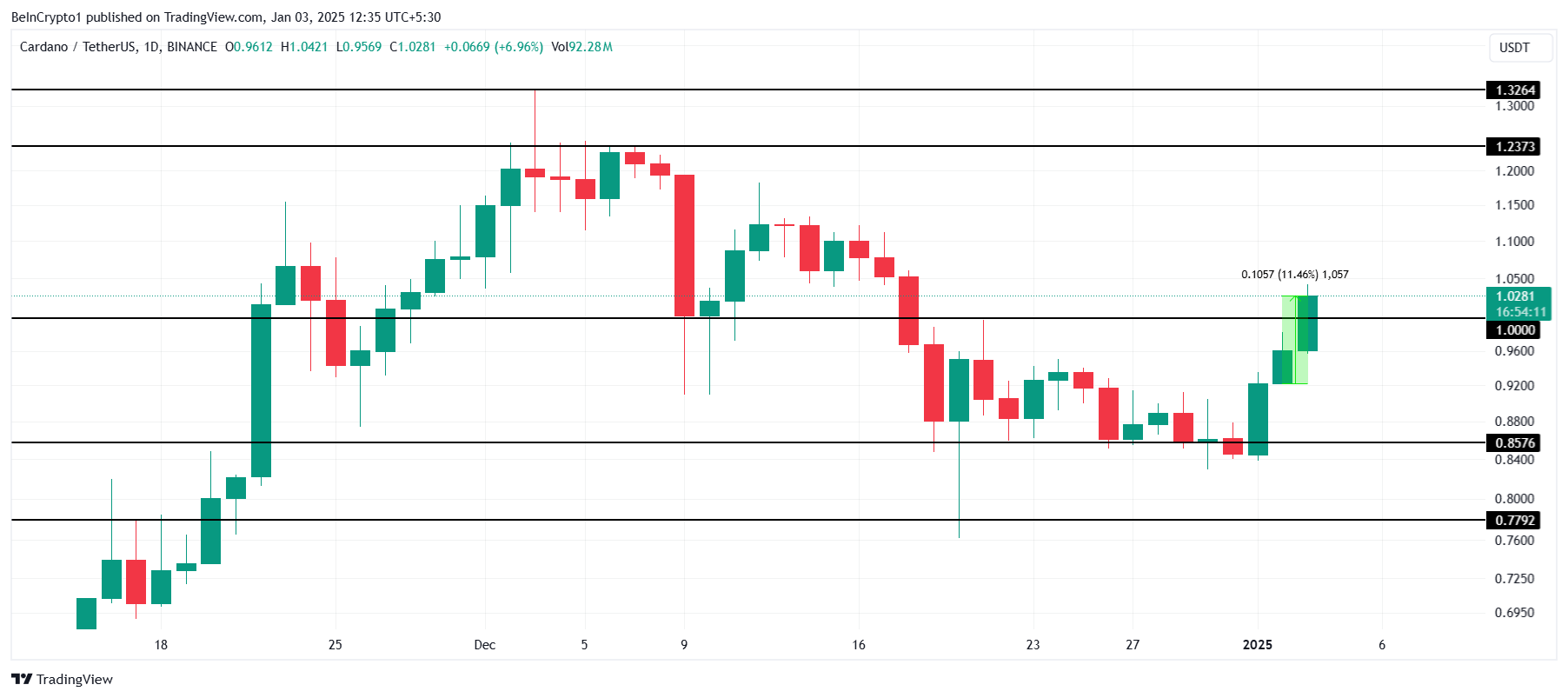 Цена Cardano выросла на 11% за последние 24 часа и составляет $1,02 на момент написания. Преодолев сопротивление на $1,00, ADA вновь вселяет оптимизм в инвесторов. Удержание этого уровня важно для сохранения уверенности на рынке.