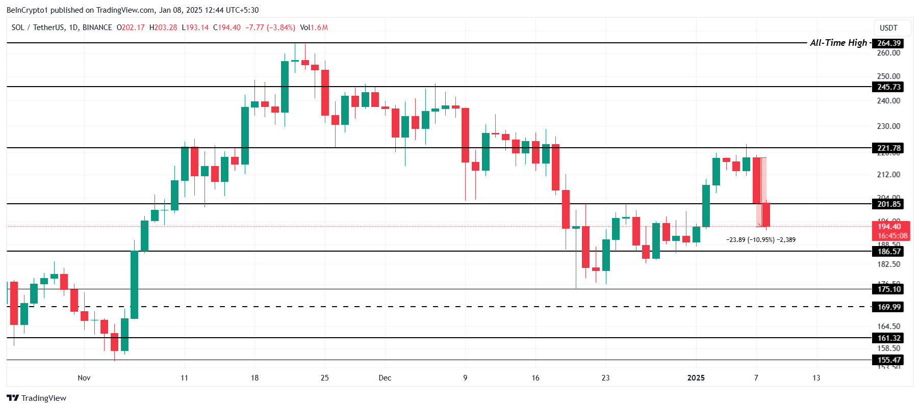 За последние сутки SOL снизилась чуть более чем на 8% и на момент написания торгуется по $196,14. Тем не менее криптовалюта по-прежнему держится выше ключевой поддержки на уровне $186.