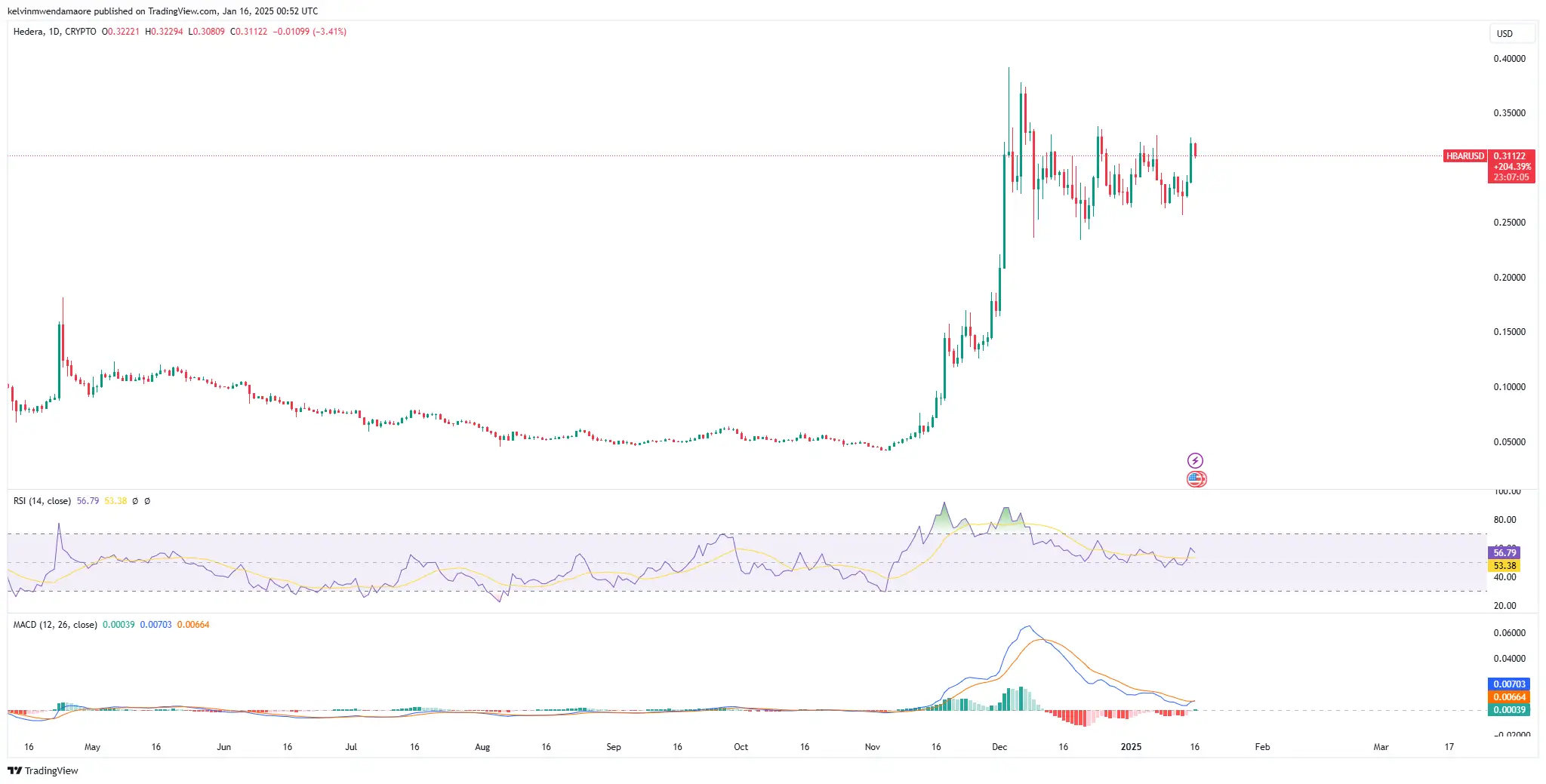 Более того, растущие объёмы торгов вблизи вершины треугольника повышают вероятность пробоя, поскольку такие тенденции в объёмах исторически предшествовали значительным движениям цен. Кроме того, индикаторы MACD и RSI предоставляют дополнительные доказательства, подтверждающие возможность бычьего пробоя HBAR.