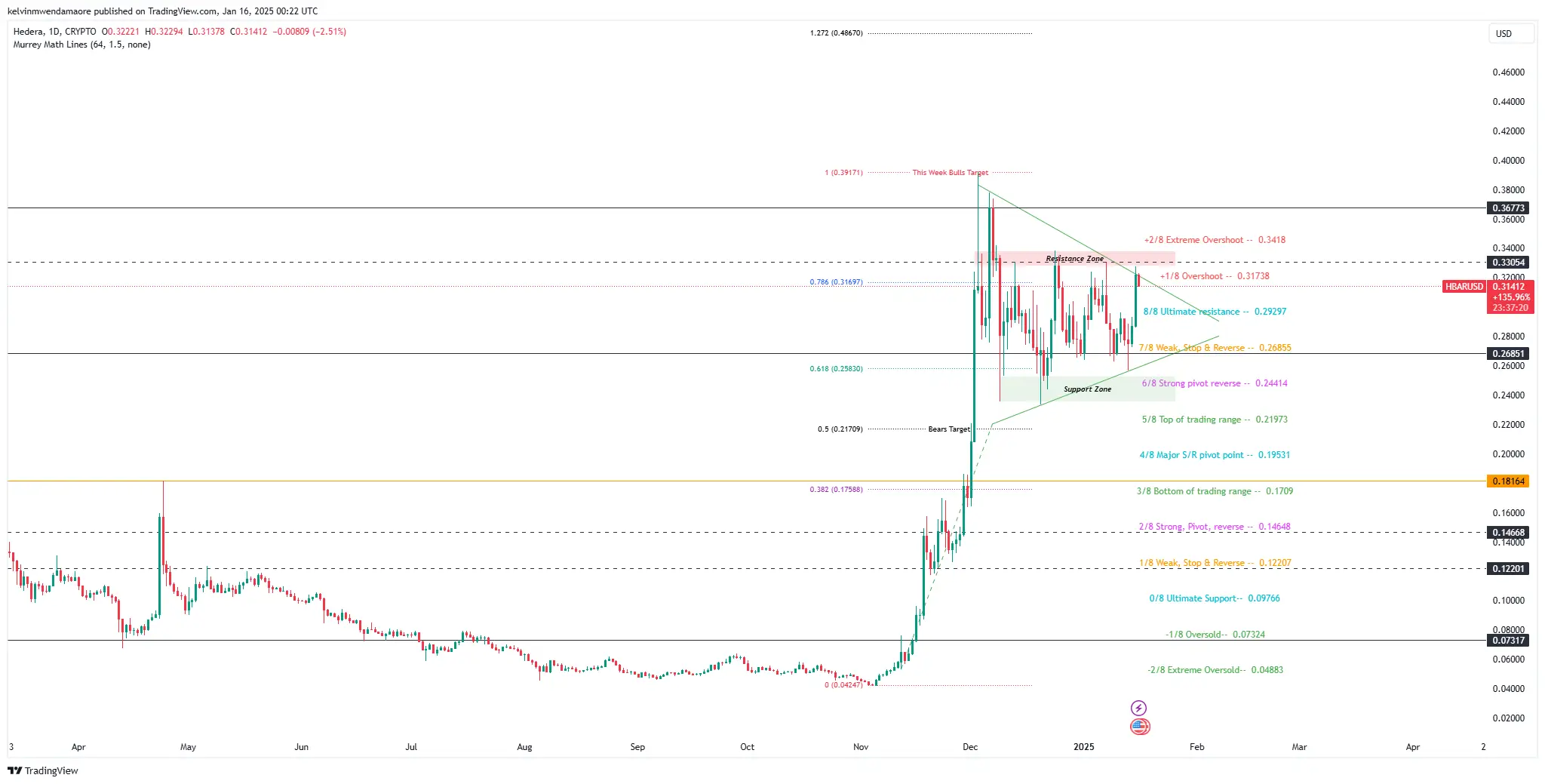 Технические индикаторы на дневном графике HBAR подтверждают этот бычий сценарий. Криптовалюта недавно отскочила от уровня коррекции Фибоначчи 0,618 на уровне 0,258 доллара, подтвердив устойчивость восходящего тренда. Линии Murrey Math также указывают на 0,317 доллара как на ключевую точку краткосрочного сопротивления, и прорыв этого уровня может подготовить почву для дальнейшего роста.