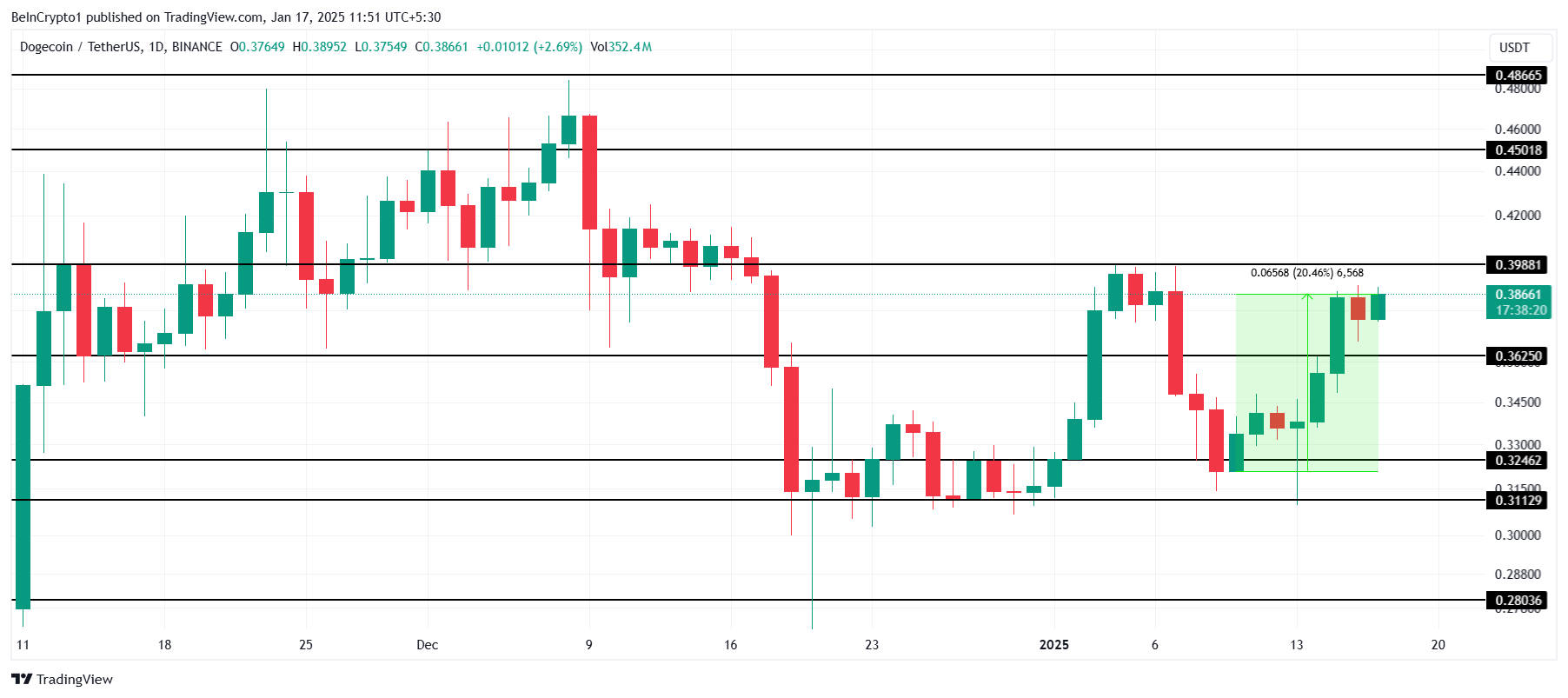 Цена Dogecoin выросла на 20% на этой неделе, вернувшись к критическому уровню $0,39. Для продолжения восходящего тренда $DOGE должен подтвердить его в качестве поддержки. Это откроет мемкоину путь к росту до $0,45.