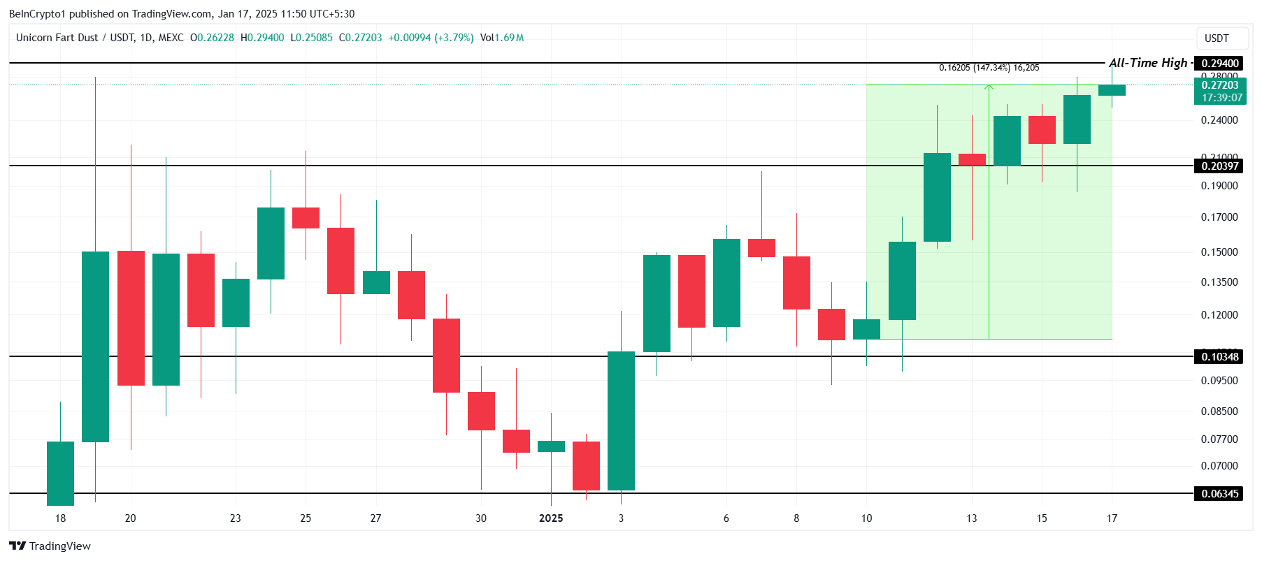 На этой неделе цена UFD выросла на 147%, обновив исторический максимум в $0,29. На момент написания мемкоин торгуется по $0,27.