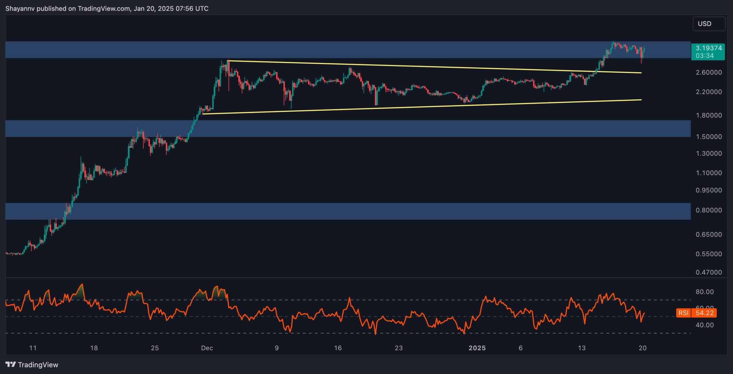 Сейчас актив достиг своего исторического максимума в 3,4 доллара, а индикатор RSI сигнализирует о состоянии перекупленности. Хотя можно ожидать временную коррекцию или консолидацию, продолжающееся давление покупателей говорит о возможности продолжения восходящего тренда к новым историческим максимумам.