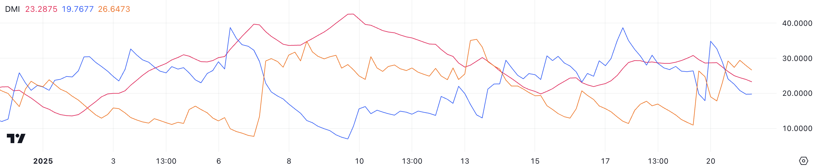 График DMI показывает, что ADX упал до 23,2 с 30,7 за последние два дня, подчеркивая ослабление тренда. Значения ADX выше 25 указывают на сильный тренд, а ниже 20 — на отсутствие направленности.