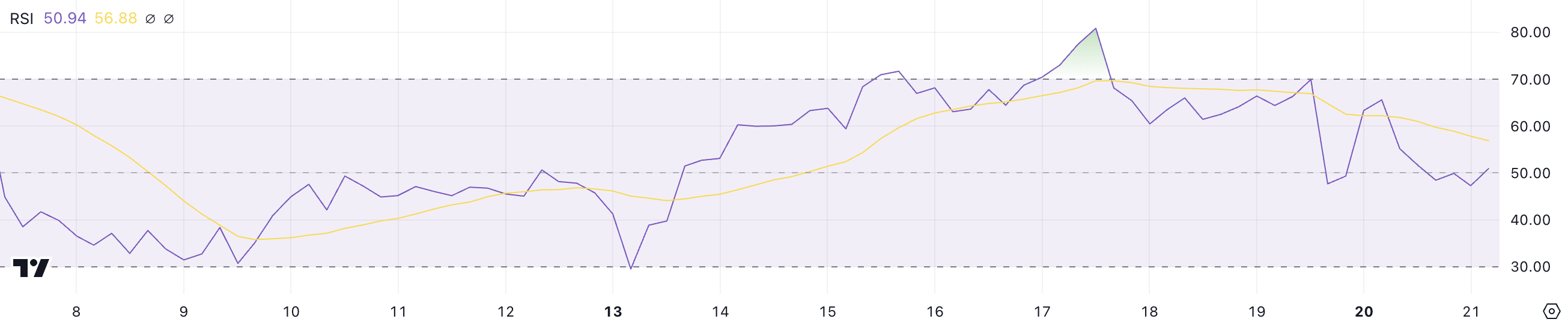 RSI биткоина на уровне 50,9 показывает баланс между давлением покупателей и продавцов. Однако при этом недавнее снижение индекса с 65,5 указывает на ослабление бычьего импульса.