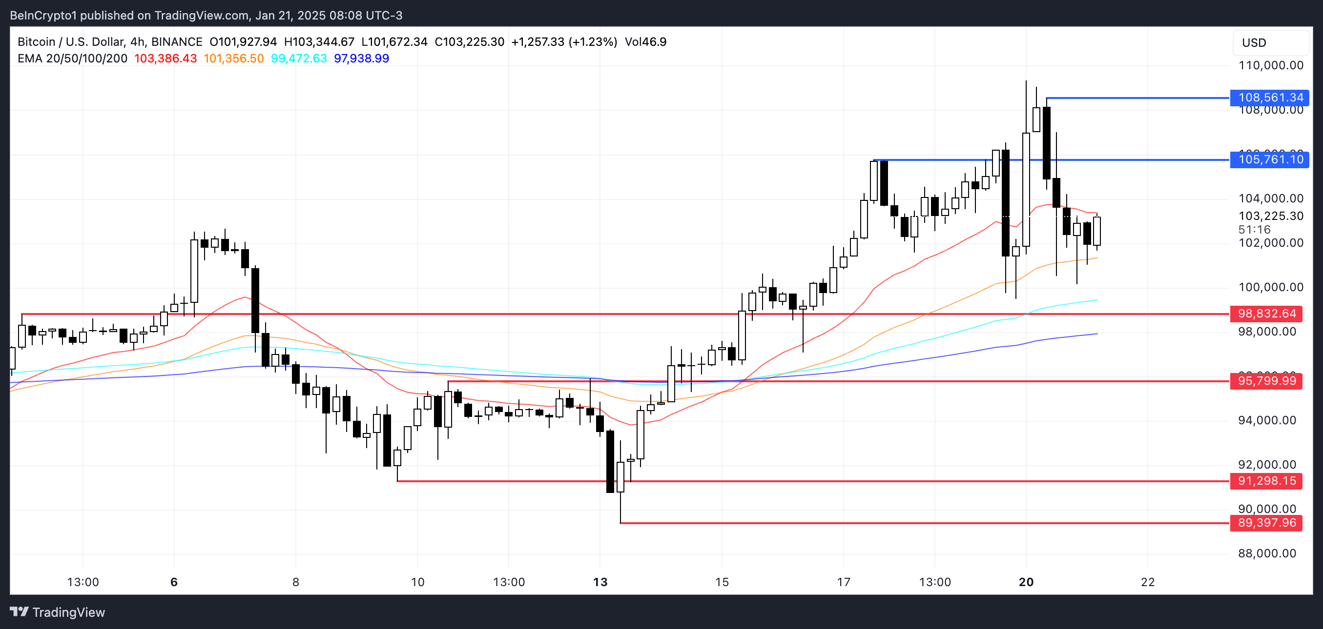 Если восходящий тренд усилится, цена может протестировать сопротивление на $105 700. Прорыв этого уровня может поднять цену до $108 500. Дальнейший бычий импульс может даже впервые ввести в игру отметку $110 000.