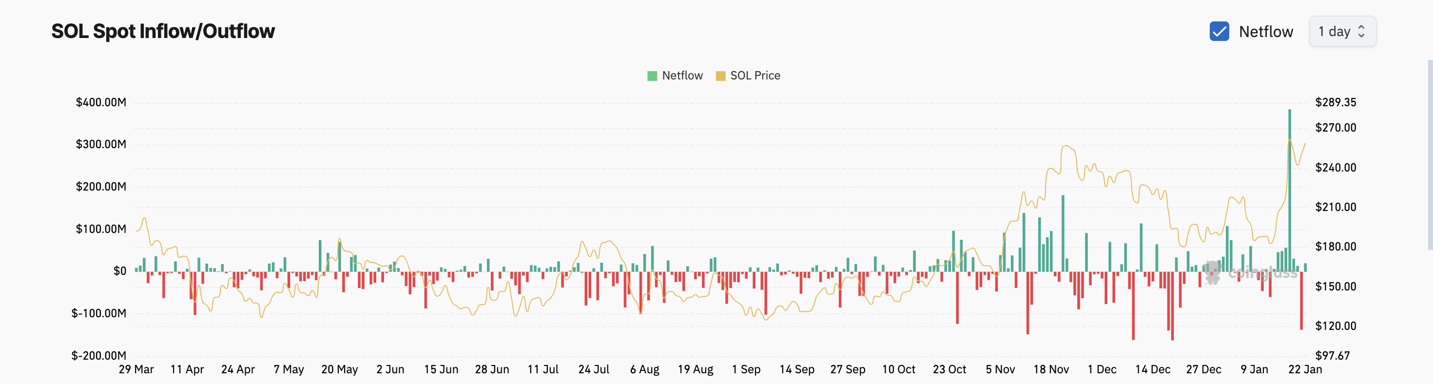 Сегодня, 22 января, на спотовых рынках Solana были зафиксированы чистые притоки капитала в размере $18,74 млн. Это сравнительно небольшая сумма, однако она хоть немного компенсирует чистый отток в $137 млн, зарегистрированный 21 января — это самый высокий отток за последние 30 дней.