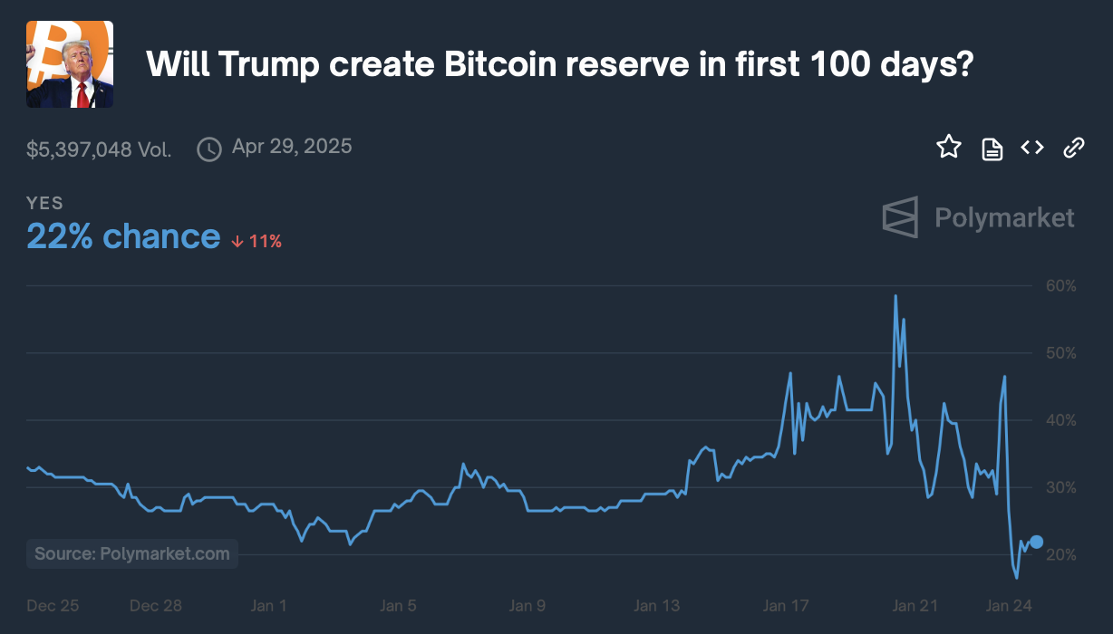 Трейдер и аналитик Скотт Мелкер (Scott Melker) отмечает растерянность участников рынка. По данным сервиса Polymarket, вероятность создания стратегического резерва биткоина в первые 100 дней президентства Трампа оценивается всего в 21%.