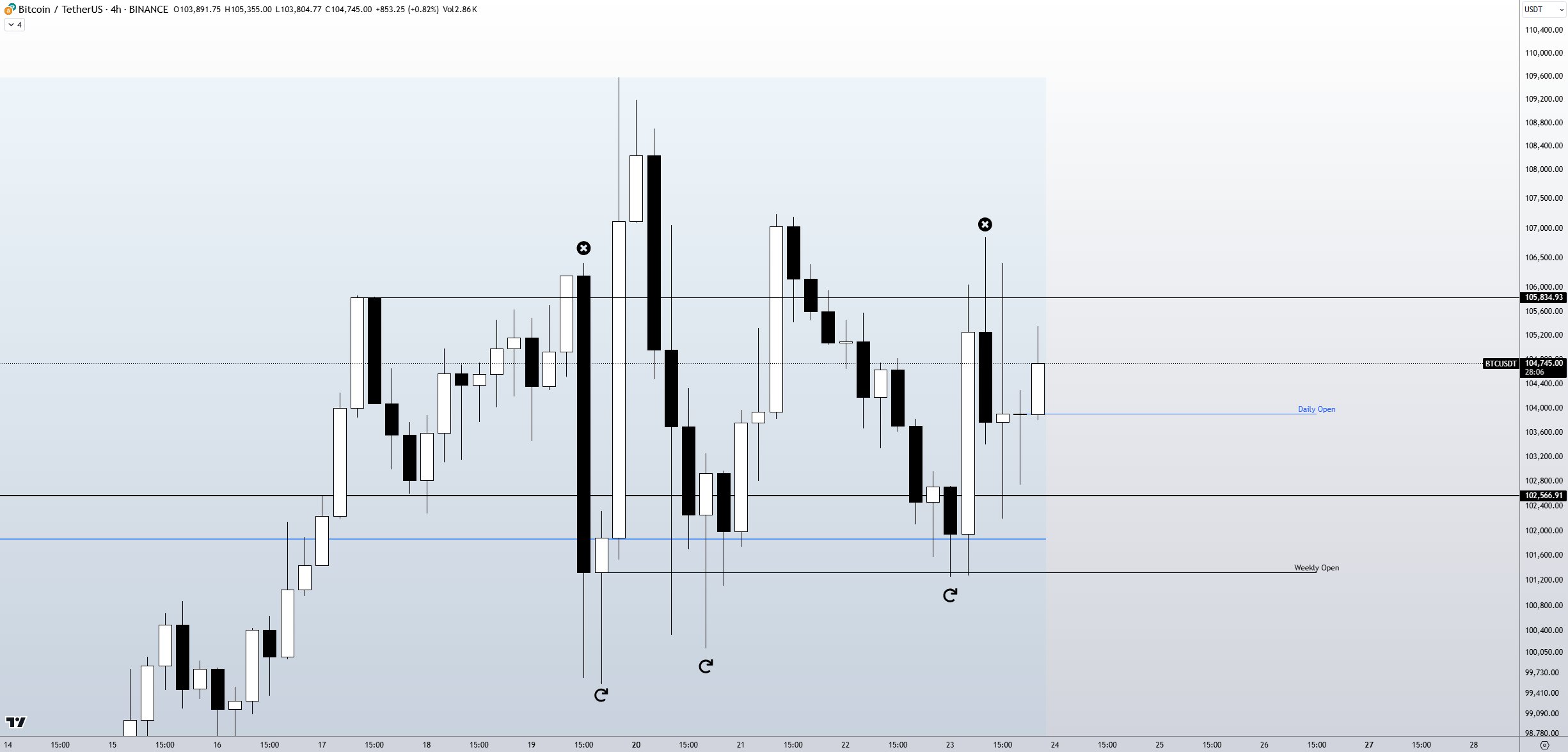 Трейдер Skew анализирует движение цены биткоина на таймфреймах от 4 часов до 1 дня, отмечая «хорошую картину» несмотря на высокую волатильность. Он указывает на четкую консолидацию между уровнями $102 000 и $106 000, которые стали ключевыми для дальнейшего движения цены.