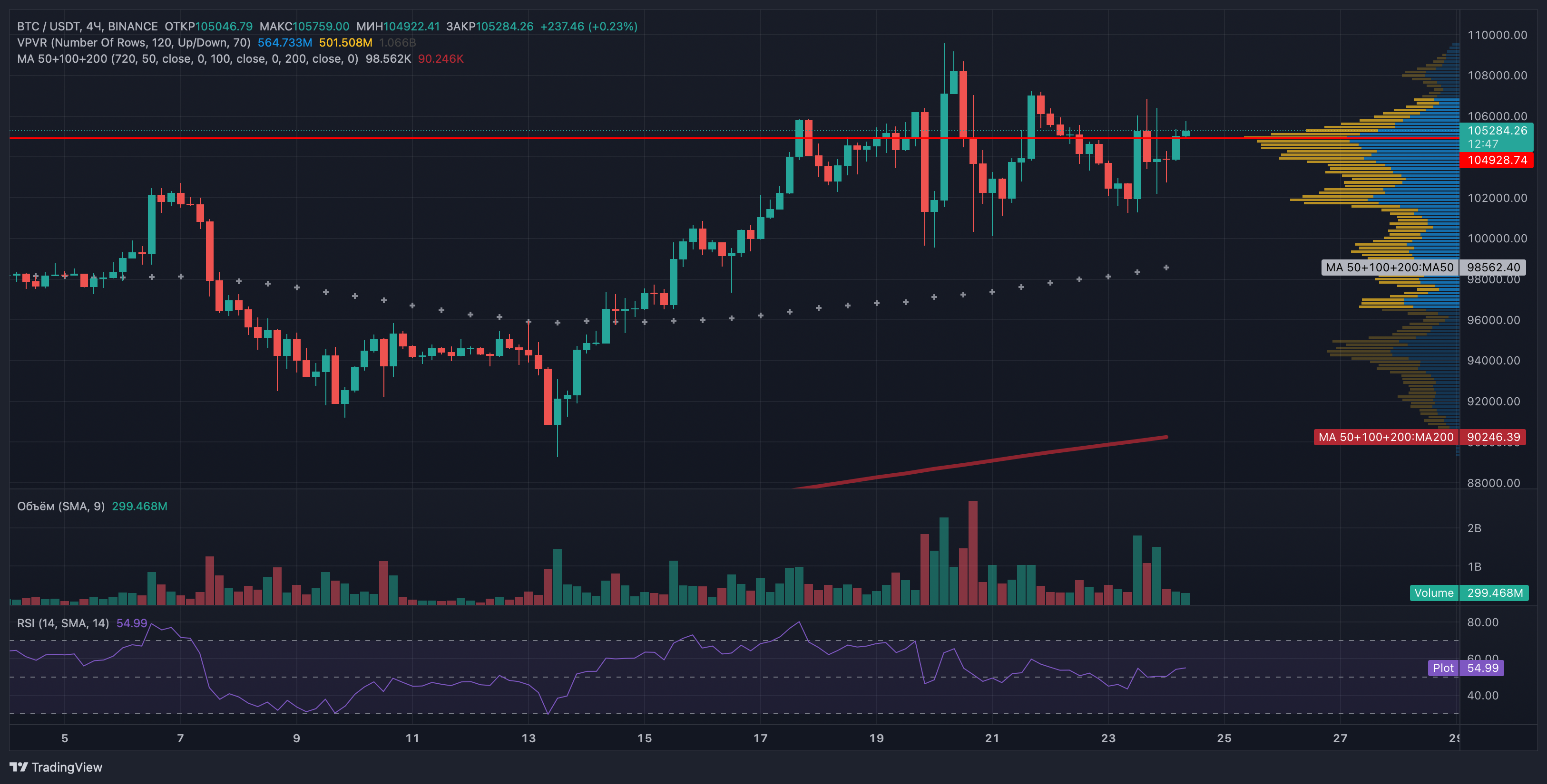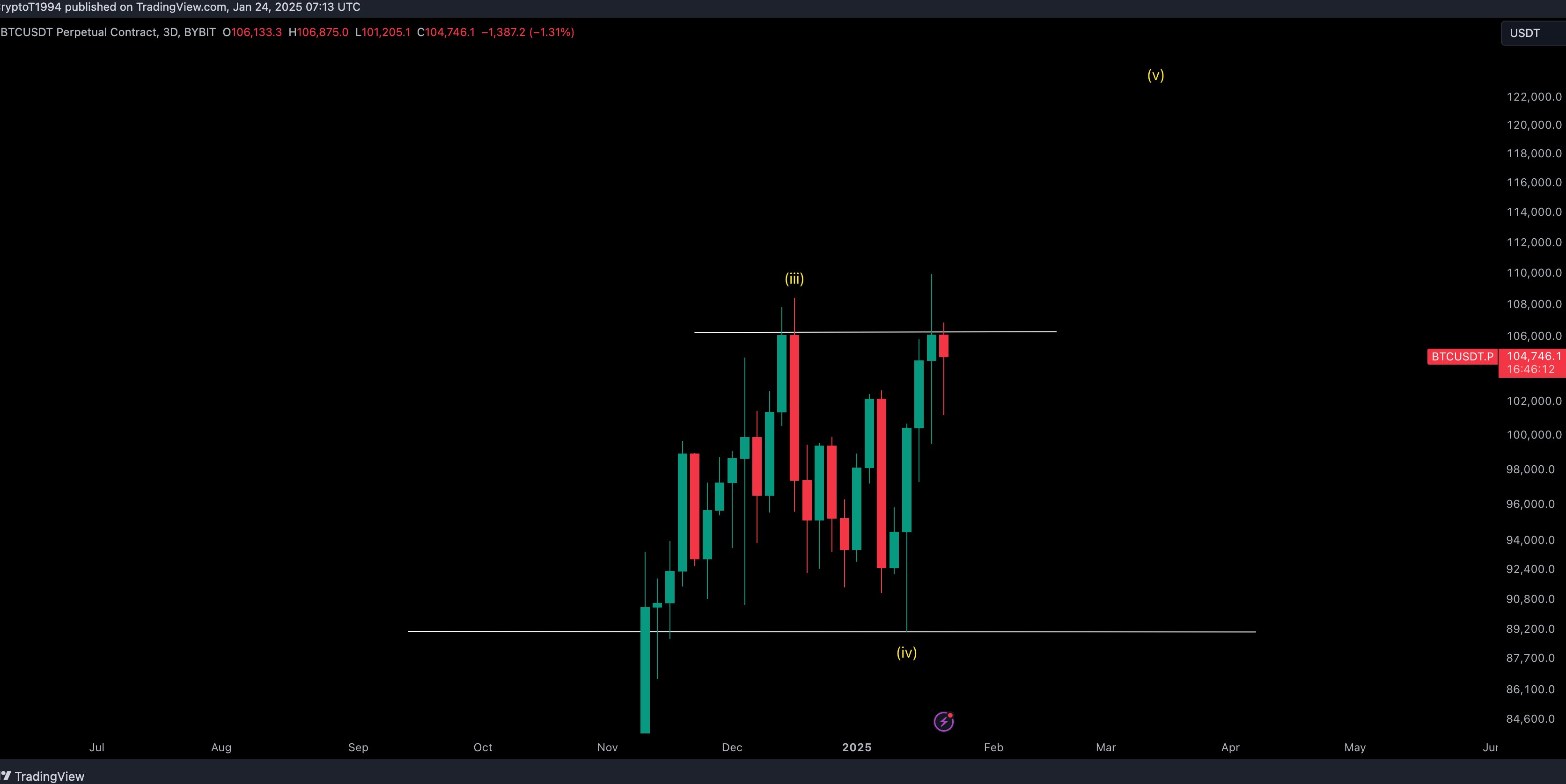 Crypto Tony подтверждает важность уровня $106 000, рассматривая его как критический для сегодняшних торгов. График трехдневных свечей по бессрочным свопам BTC/USDT указывает на потенциальное движение к цели около $122 000.