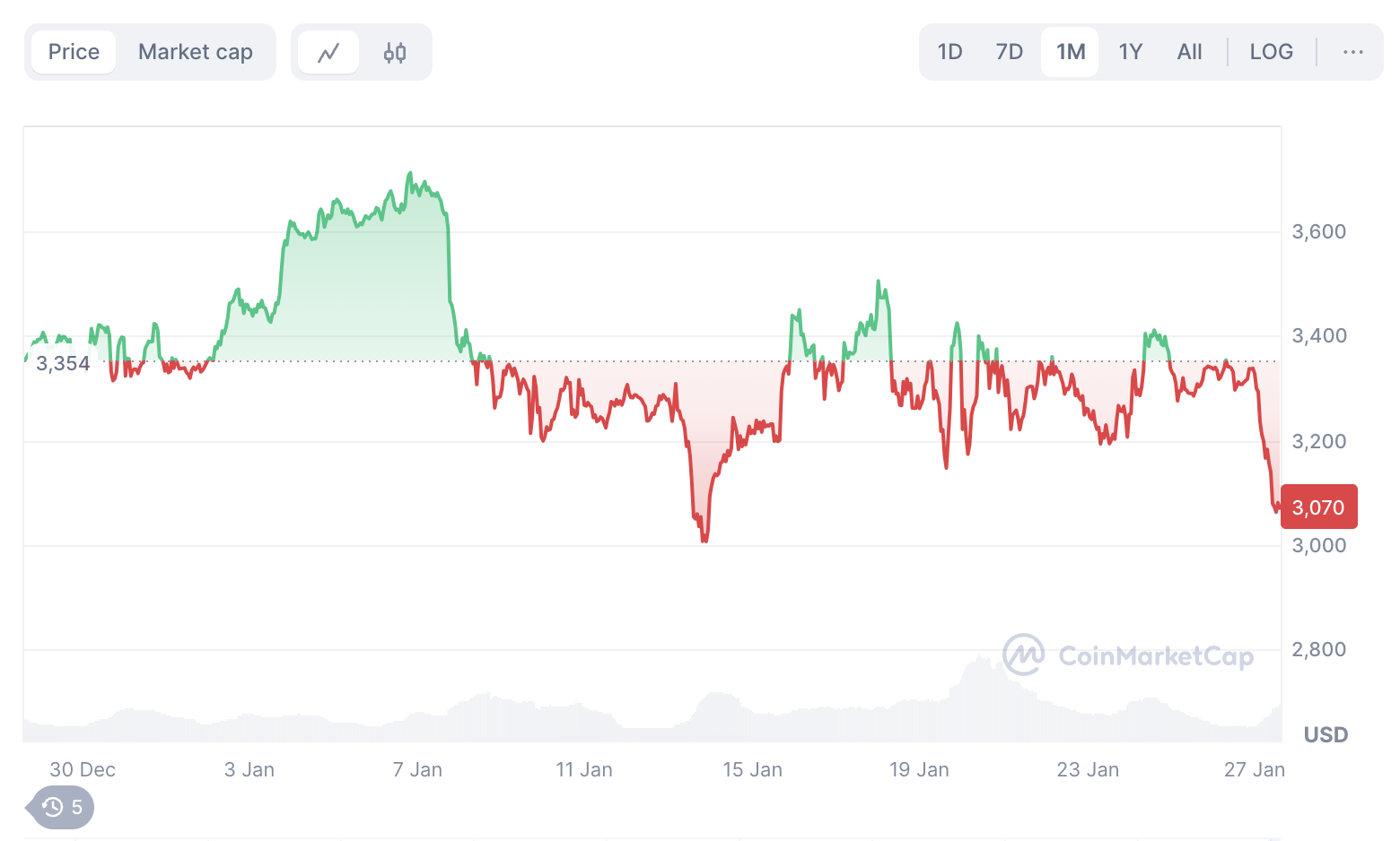 Многие инвесторы теряют уверенность в $ETH. На протяжении долгого времени цена альткоина остается на одном уровне, не в силах преодолеть отметку $4 тыс. За январь стоимость Ethereum и вовсе опустилась более чем на 8%.