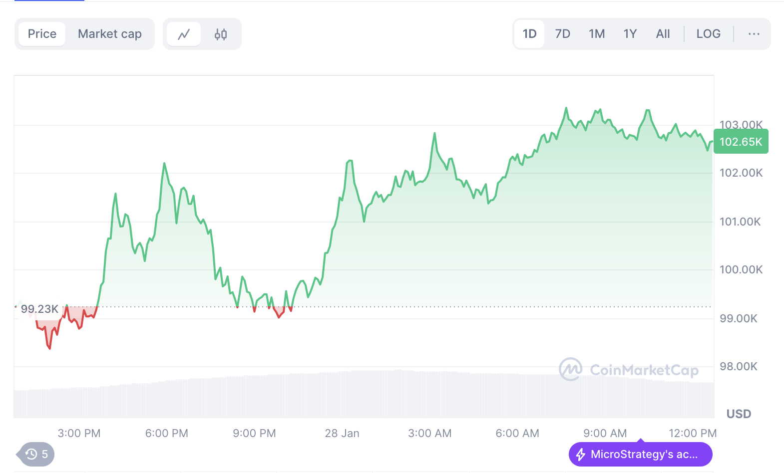 По данным CoinMarketCap, на момент написания материала биткоин торгуется по $102 650. За последние сутки цена BTC выросла на 3,5%.