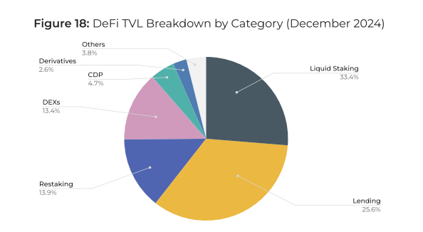 Одним из основных драйверов стали проекты в категории ликвидного стейкинга. В течение года объем заблокированных активов удвоился с $30 млрд до $60 млрд. Эта категория занимает первое место в сегменте DeFi с 33,4% общего TVL.