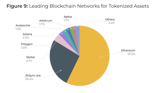 Свыше 90% рынка пришлось на Ethereum (57,2%) и ZKsync Era (26,4%). На третьем месте — Stellar (4,1%).