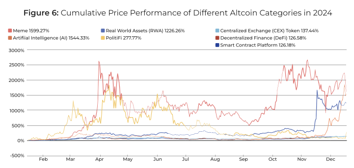Мем-коины оказались самым успешным сегментом. Кумулятивный рост цен 900 крупнейших активов с поправкой на капитализацию составил около 1600%. Этот показатель не учитывает множество провалившихся проектов, запущенных на платформах вроде Pump.fun и Moonshot.