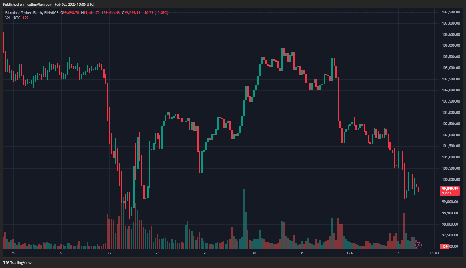На момент подготовки материала биткоин торгуется на уровне $99 599, по данным TradingView. За прошедшую неделю курс актива снизился на 4,9%.