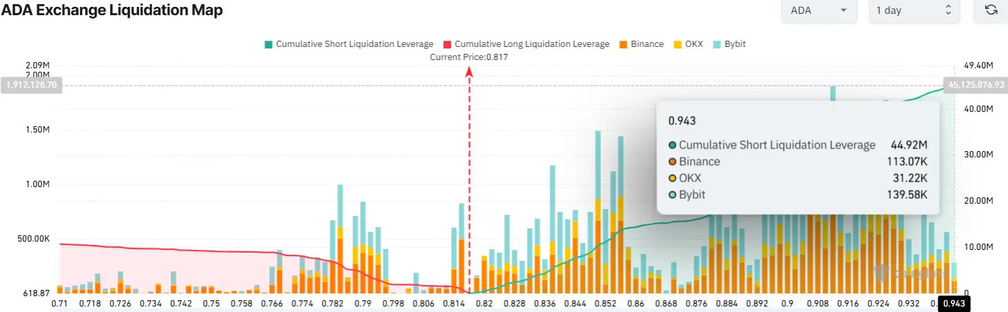 В связи с продолжающимся медвежьим ценовым движением трейдеры значительно увеличивают свои ставки на снижение курса криптовалюты Cardano (ADA), как показывает карта ликвидации, предоставленная CoinGlass. Данные свидетельствуют о том, что на рынке доминируют продавцы коротких позиций, что повышает риск ликвидации бычьих длинных позиций.