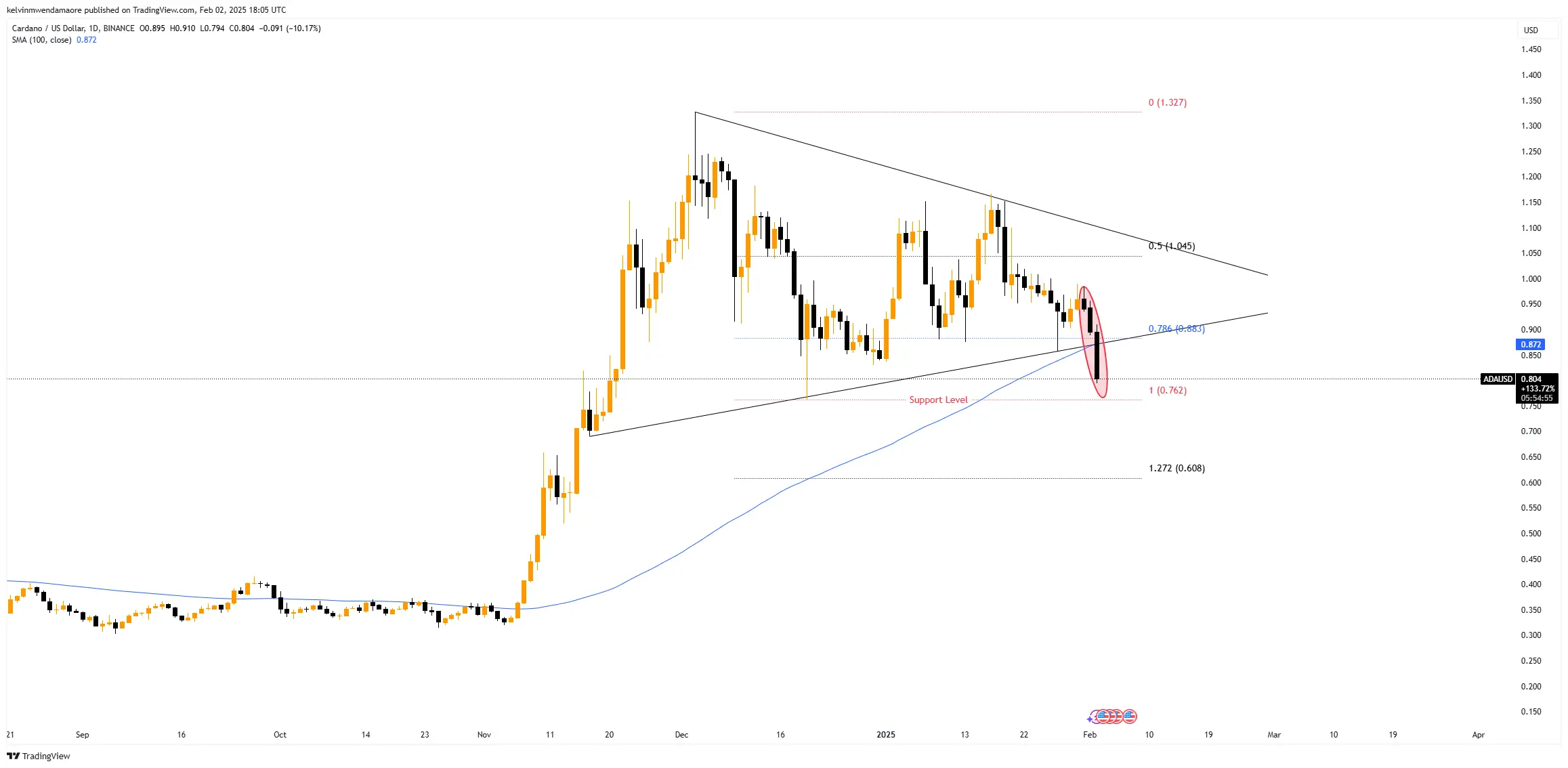 Токен Cardano (ADA) сталкивается с усилением медвежьего давления, поскольку он опустился ниже критических уровней поддержки. Криптовалюта, которая в настоящее время торгуется по цене 0,804 доллара, опустилась ниже уровня коррекции Фибоначчи 0,786 в 0,883 доллара и 100-дневной простой скользящей средней (SMA) в 0,872 доллара. Это движение сигнализирует о потенциальном дальнейшем снижении, поскольку на рынке доминируют продавцы.