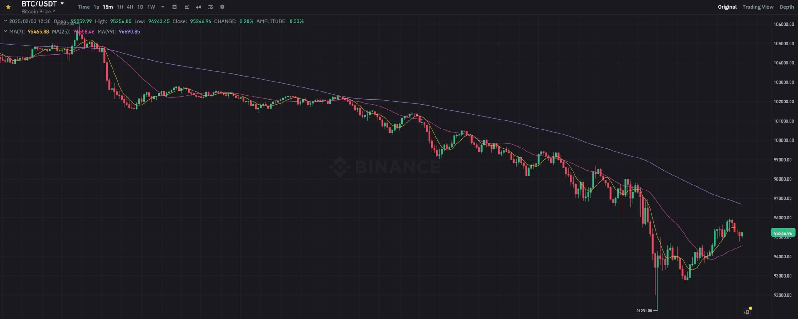 Сегодня ночью Биткоин достиг локального минимума на уровне 91 231 доллара на бирже Binance, после чего криптовалюта восстановилась до 95 тысяч.