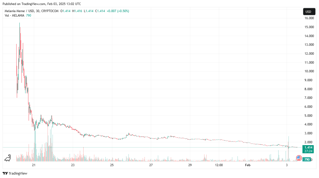 Мем-коин супруги президента Мелании Трамп MELANIA, запущенный вскоре после TRUMP, продолжил падение. На момент написания цена составляет около $1,42 — на 90% ниже ATH в $15,5.
