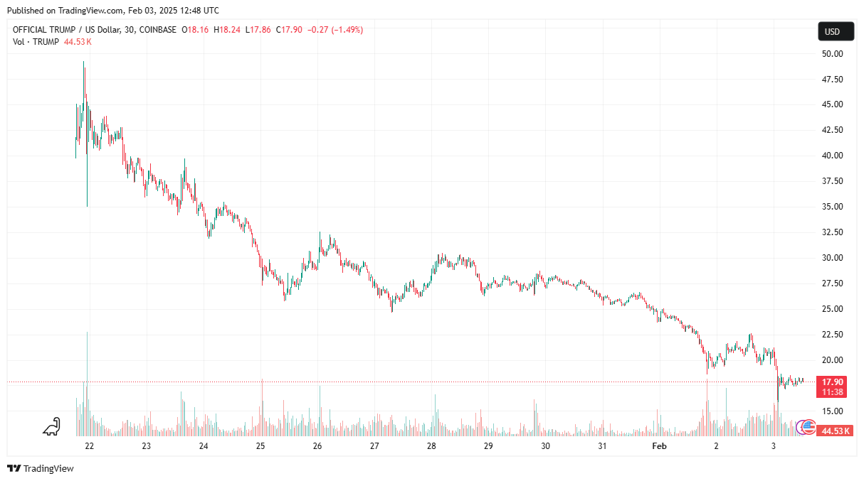 Исторический максимум цены TRUMP зафиксирован 21 января на отметке $48,59.