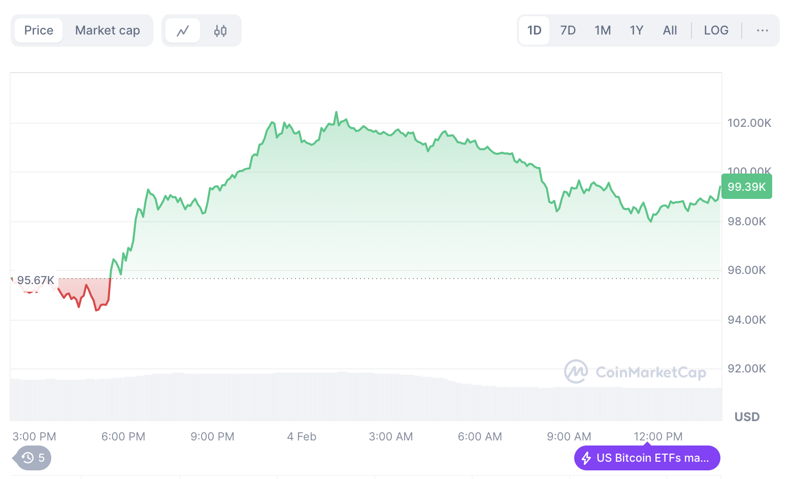 На момент написания материала биткоин торгуется по $99 375. За последние сутки цена BTC выросла на 3%.