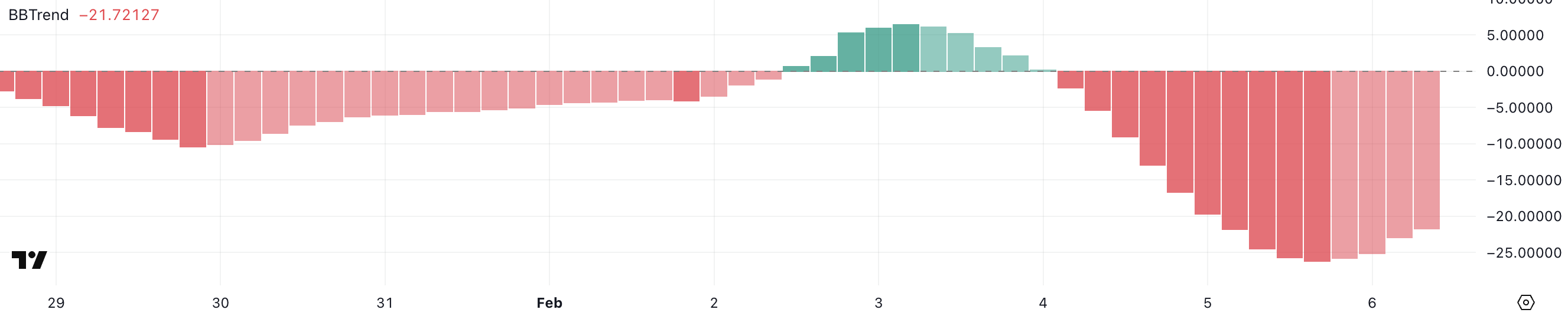 Тем временем BBTrend для токена остается отрицательным последние два дня и на момент публикации составляет -21,7. Вчера индикатор находился заметно глубже в отрицательной зоне — на отметке -26,1.