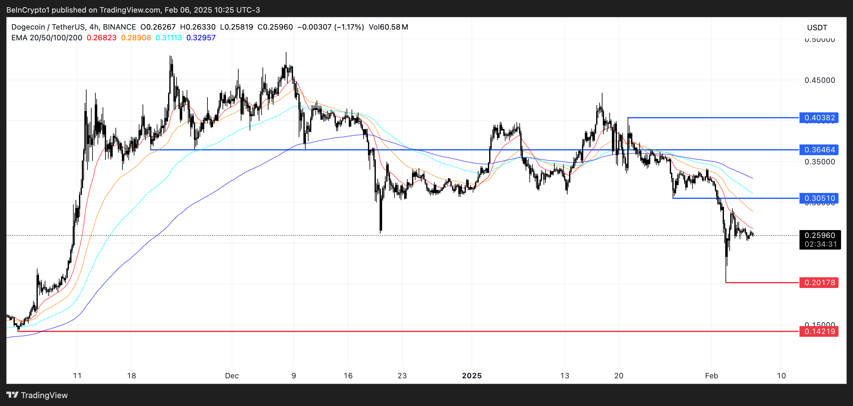 Если ситуация не изменится в лучшую сторону, то можно будет ожидать падения курса Dogecoin до $0,20. Если этот уровень не выстоит, тогда цене будет грозить откат до $0,14 — самого низкого уровня с 10 декабря 2024 года.