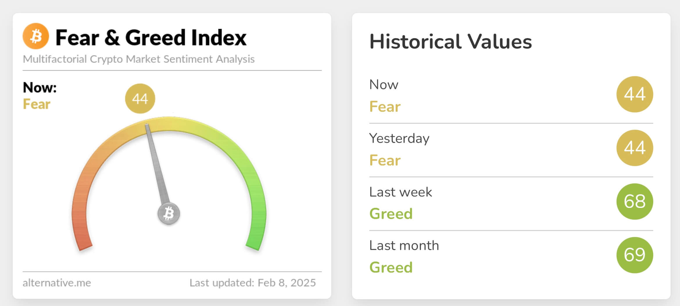 Сегодня так называемый индекс страха и жадности Биткоин-инвесторов находится на уровне 44 баллов из 100. Это значит, что держатели капитала боятся продолжения просадки рынка и не спешат открывать новые позиции в крипте. Вот соответствующий график.