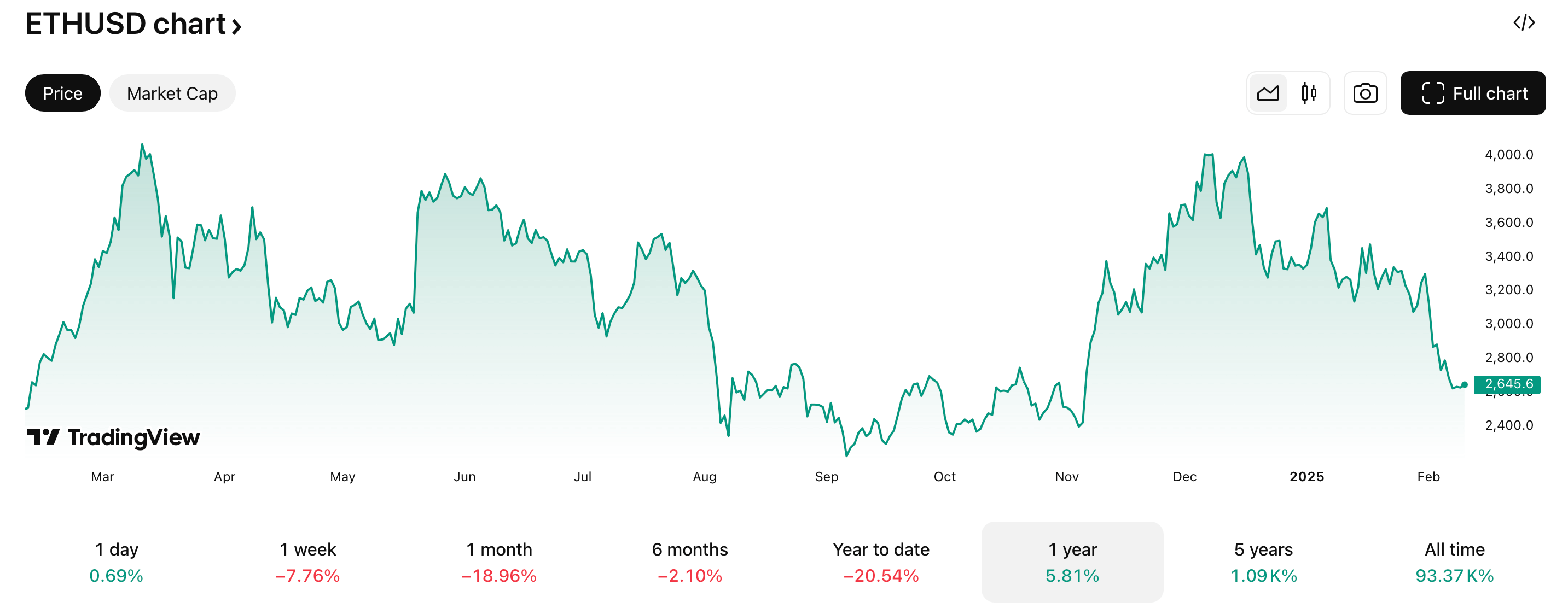 Показатели ETH действительно не впечатляют на этом буллране. Например, за последний год криптовалюта выдала всего 5.8 процента роста, что видно на графике ниже.